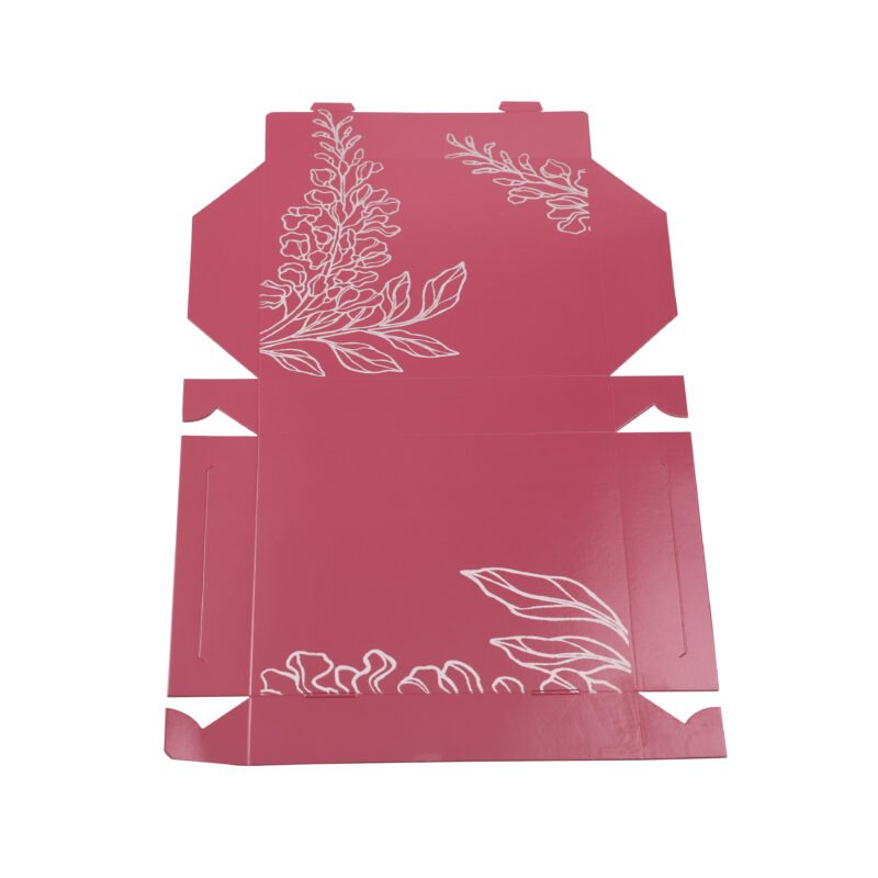 A elegantly designed box with gold flower design foiled on a maroon background.The flap has a locking arrangment for easy closure of the box