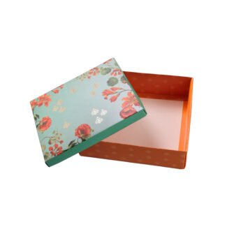 A unique Gift Box with Decorative Floral Design Lid .You can Put Gifts or Chocolates along with 2 Diyas. The two circular spots are designed to hold Diyas and rest of the space could be used for Chocolates or Gifts